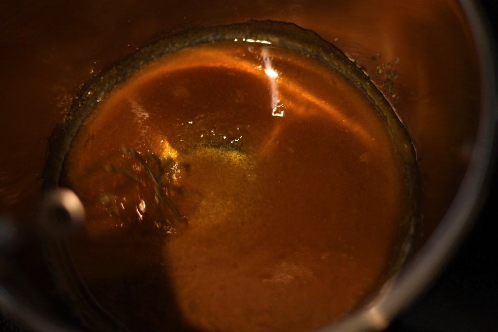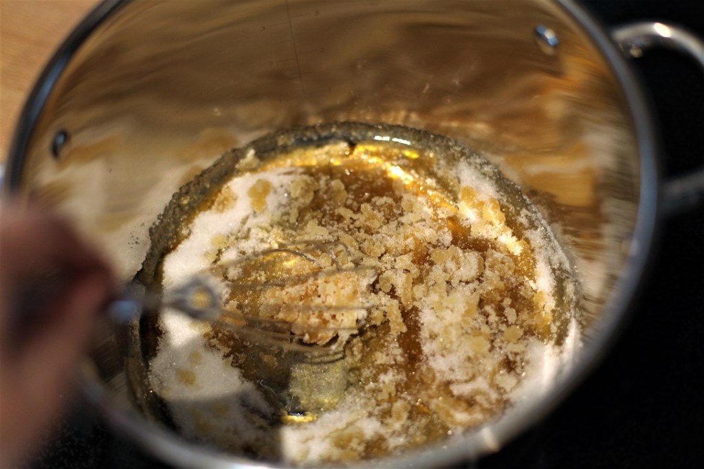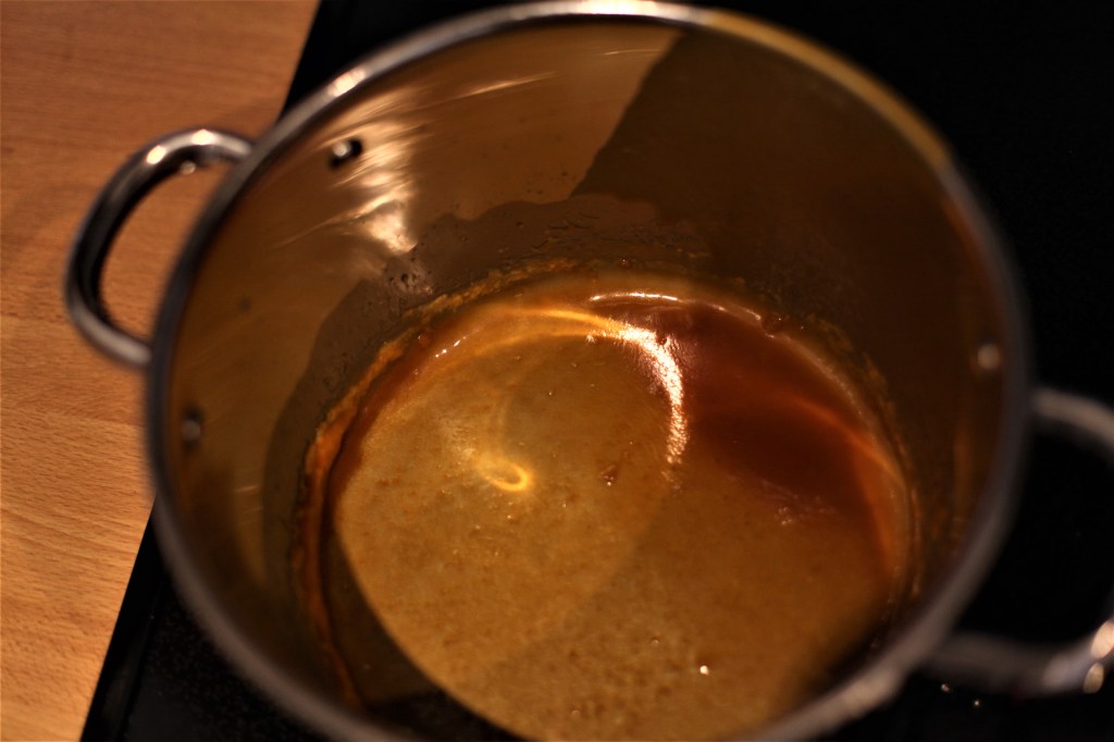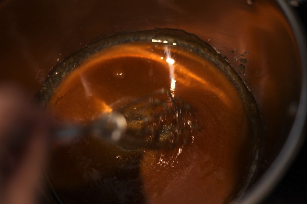 2. Ikke rør i sukkeret før du ser at sukkeret har begynt og smelte godt rundt kanten på kjelen. La så sukkeret smelte til det får en fin karamell farge og til alle sukker korna er smeltet. Da kan du røre med en visp. Skru så av platen.
