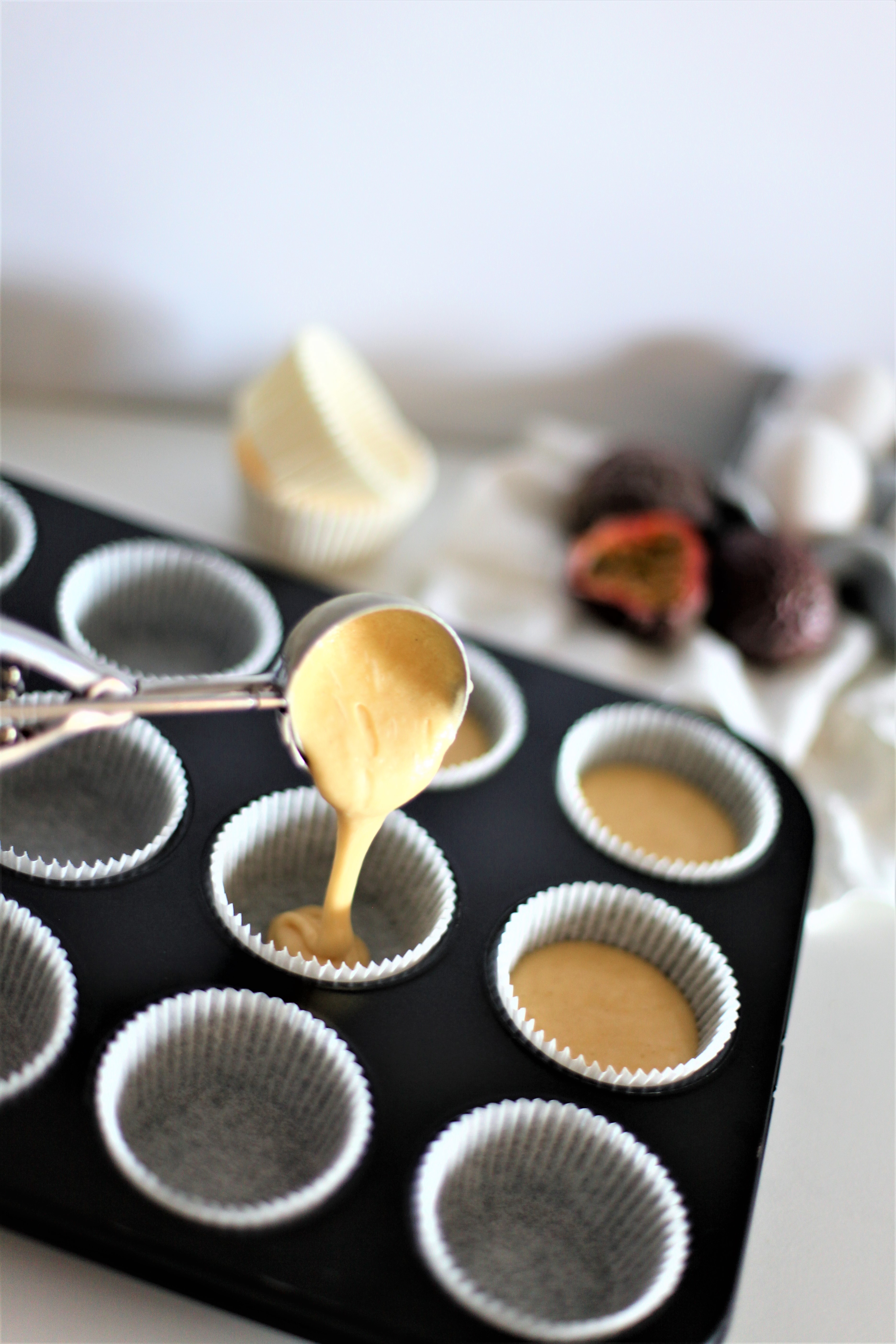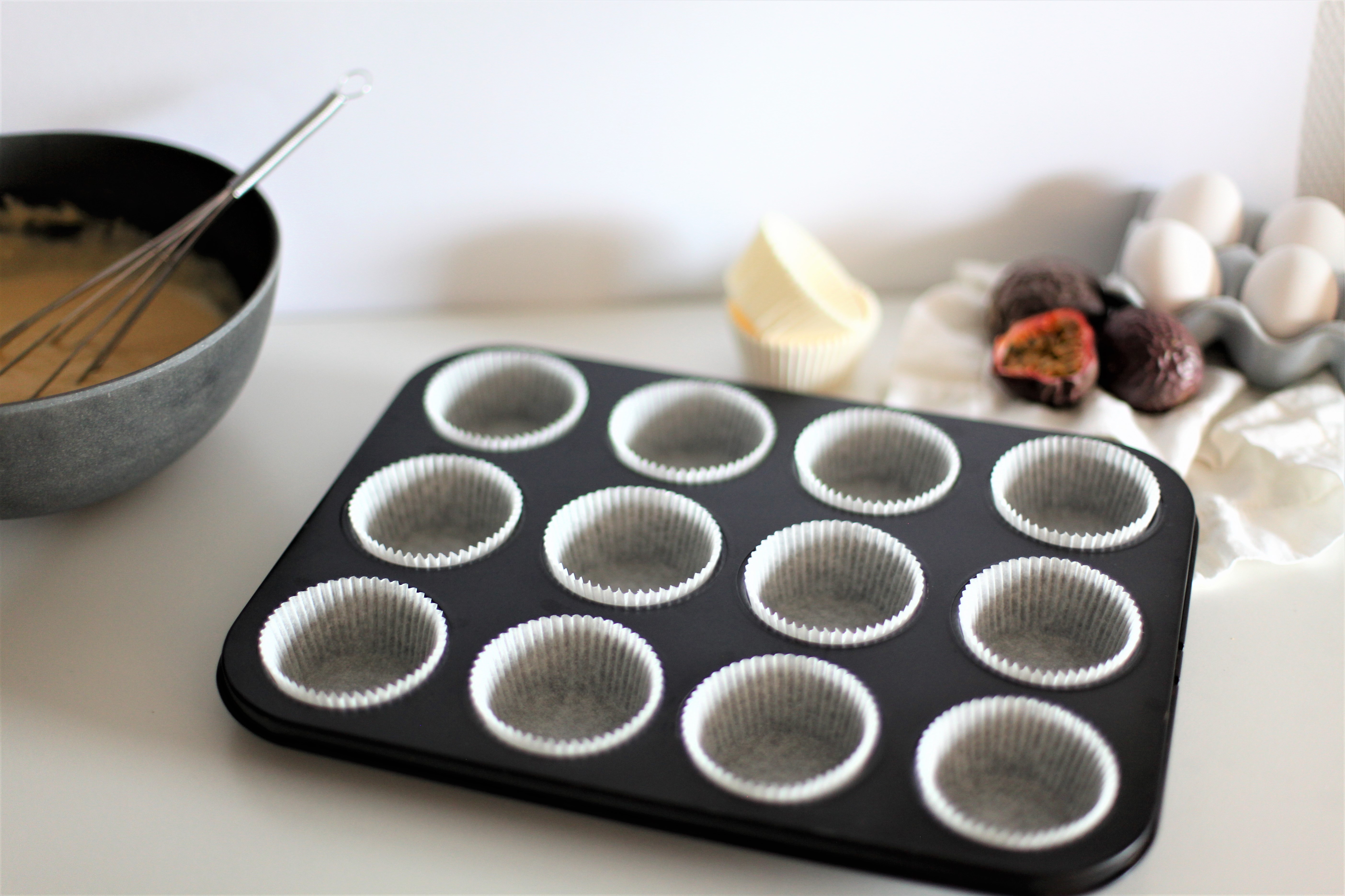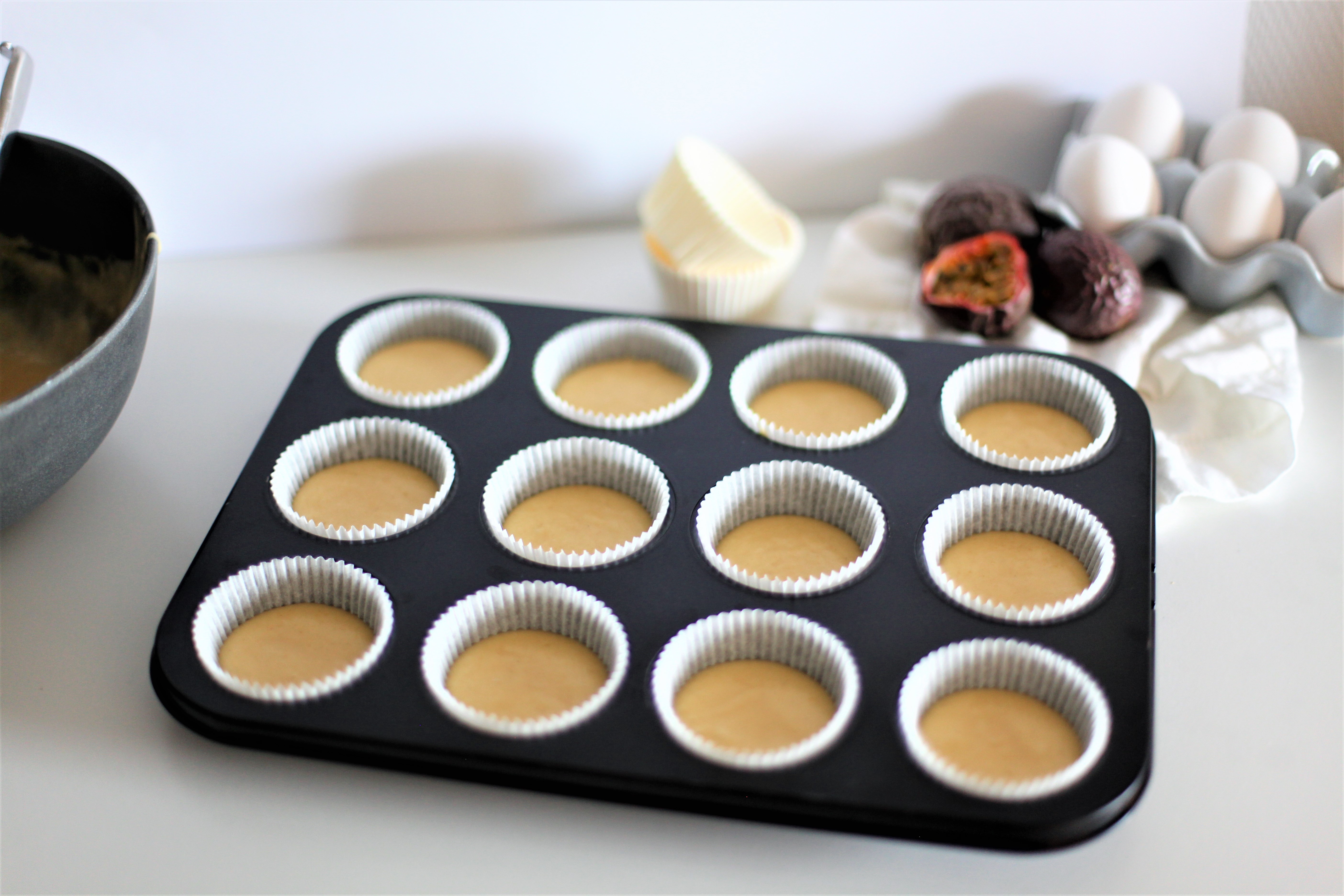 - Lag pasjonsfruktsaus og sett til avkjøling. Sett så stekeovnen på over og undervarme på 160°C. Smelt så smøret og sett til avkjøling. Sett klar muffinsbrettet og muffinsformer.