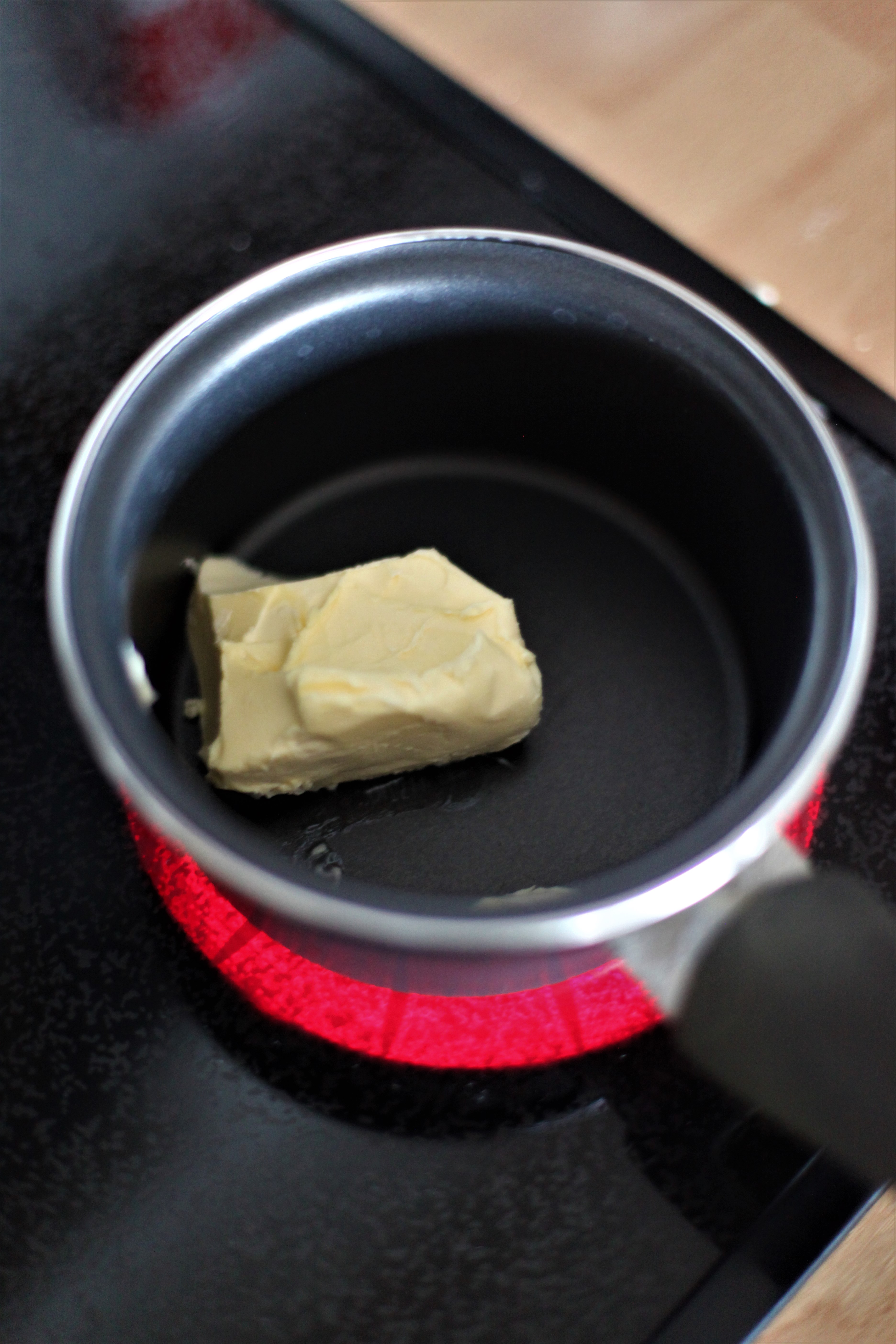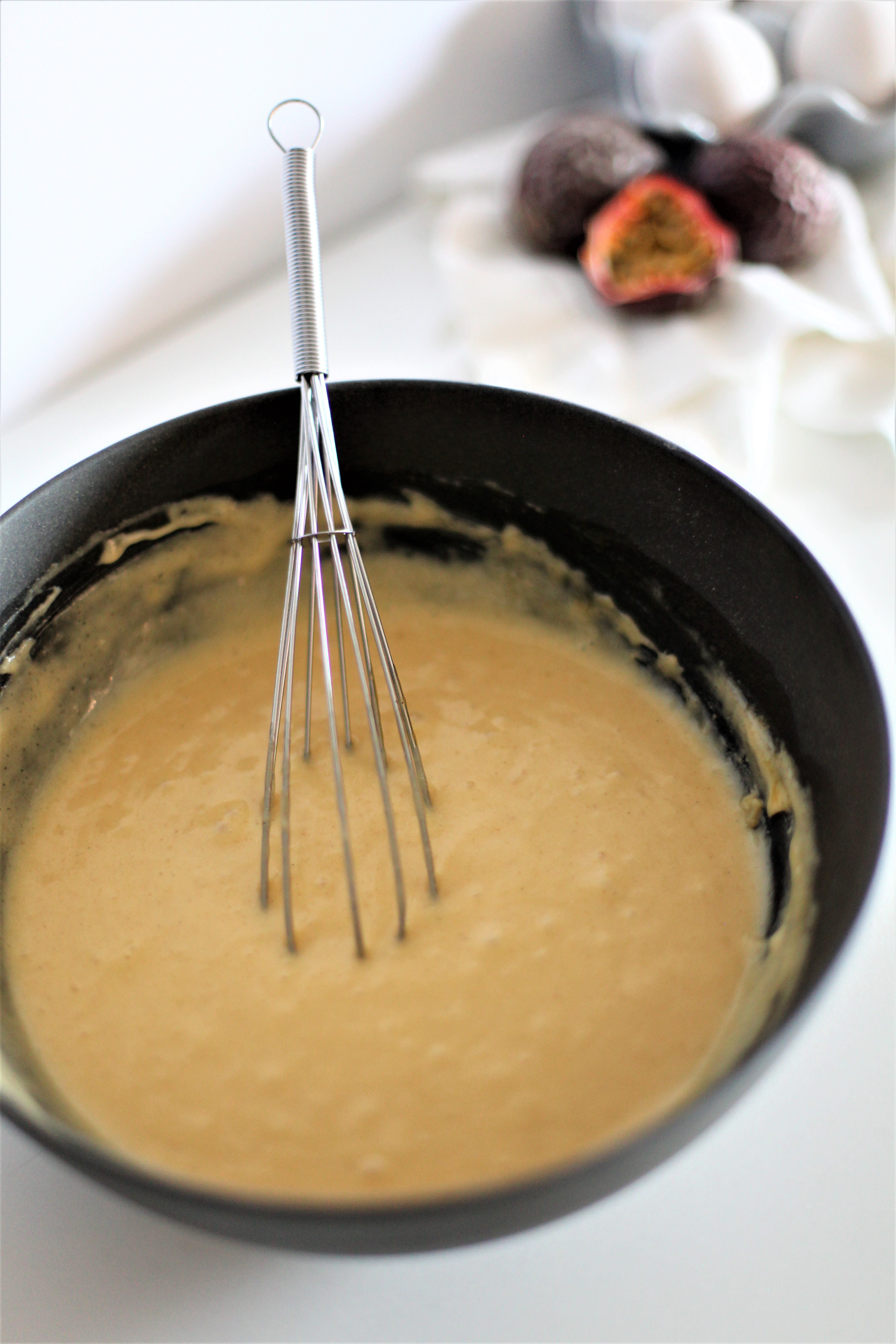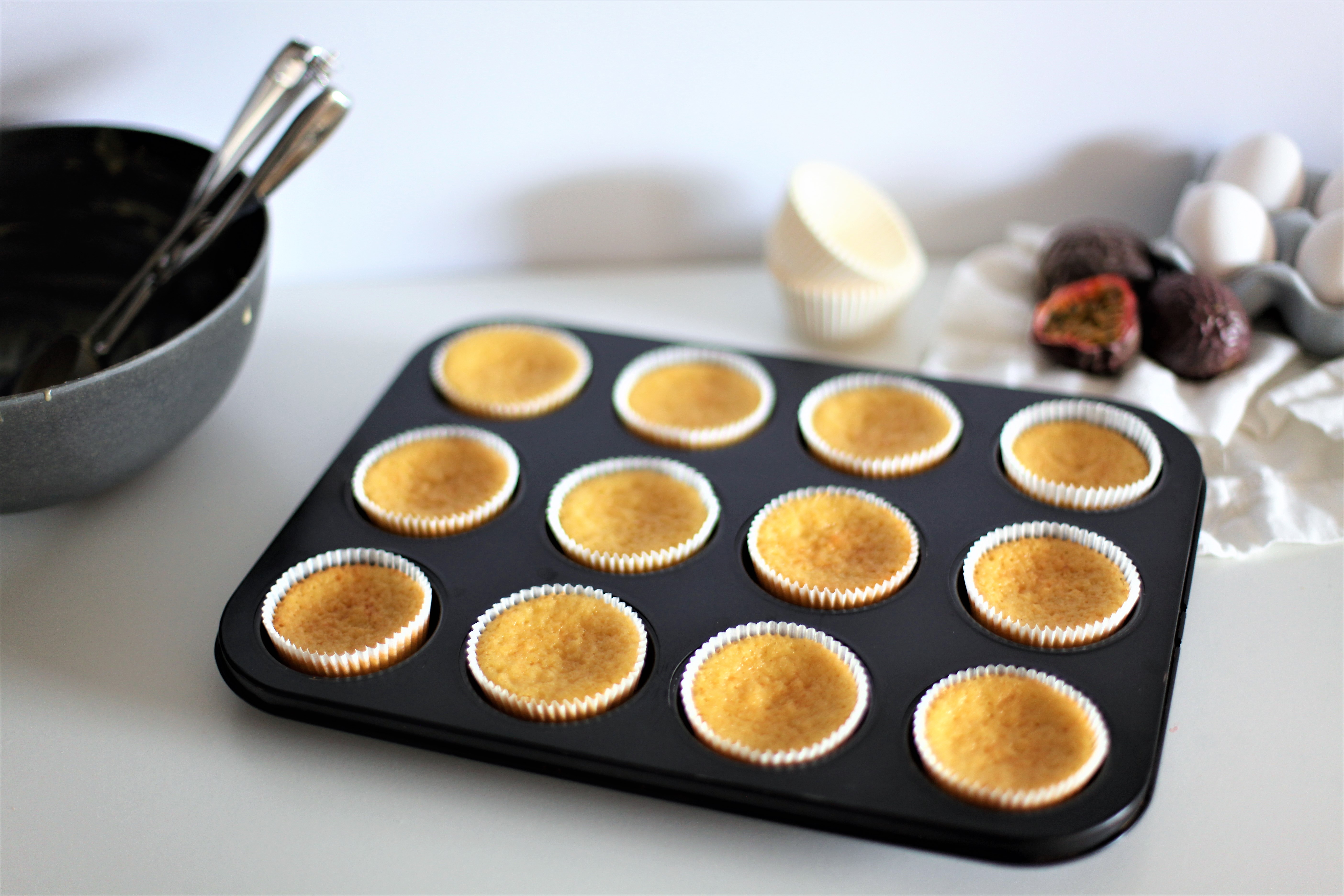 - Lag pasjonsfruktsaus og sett til avkjøling. Sett så stekeovnen på over og undervarme på 160°C. Smelt så smøret og sett til avkjøling. Sett klar muffinsbrettet og muffinsformer.