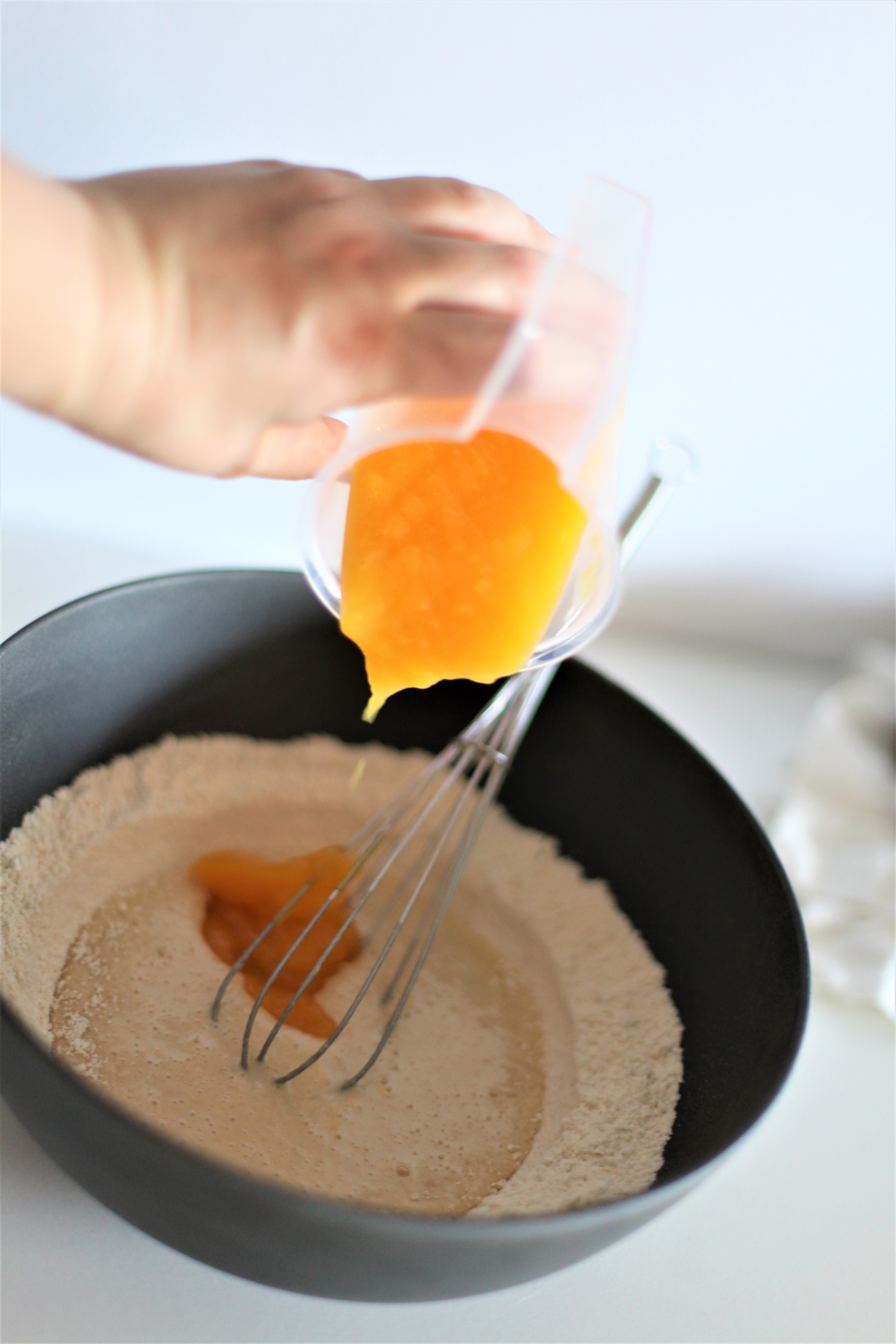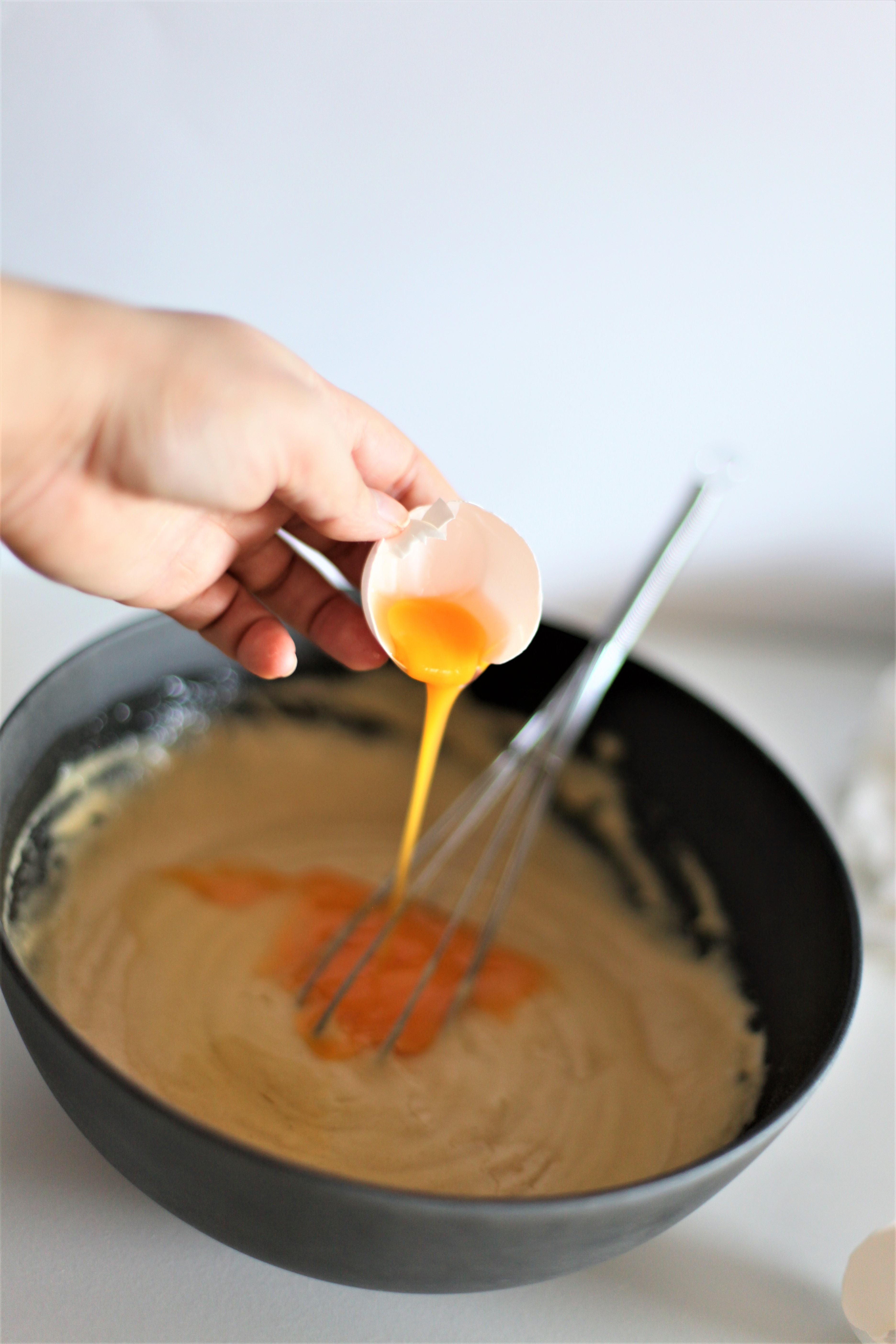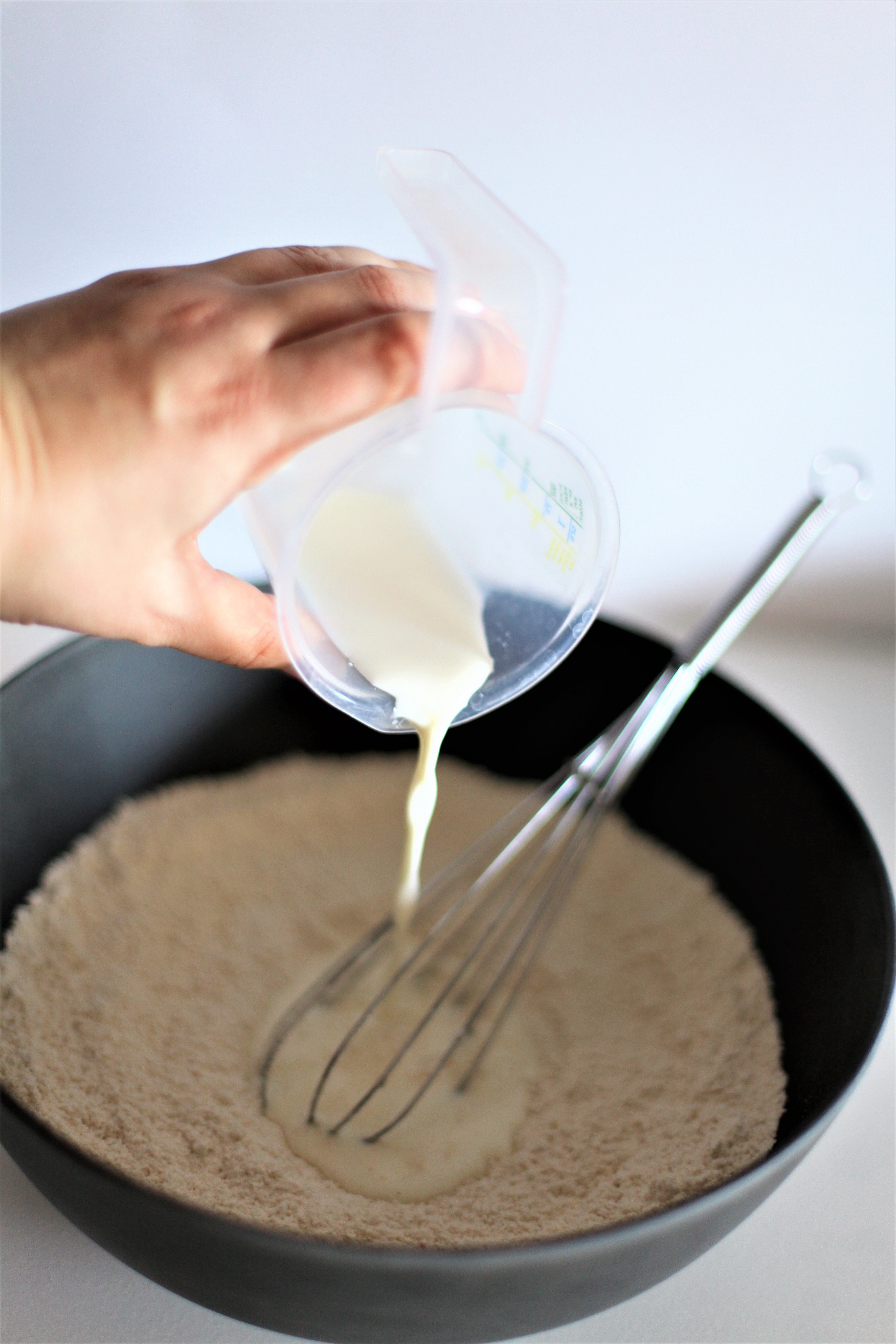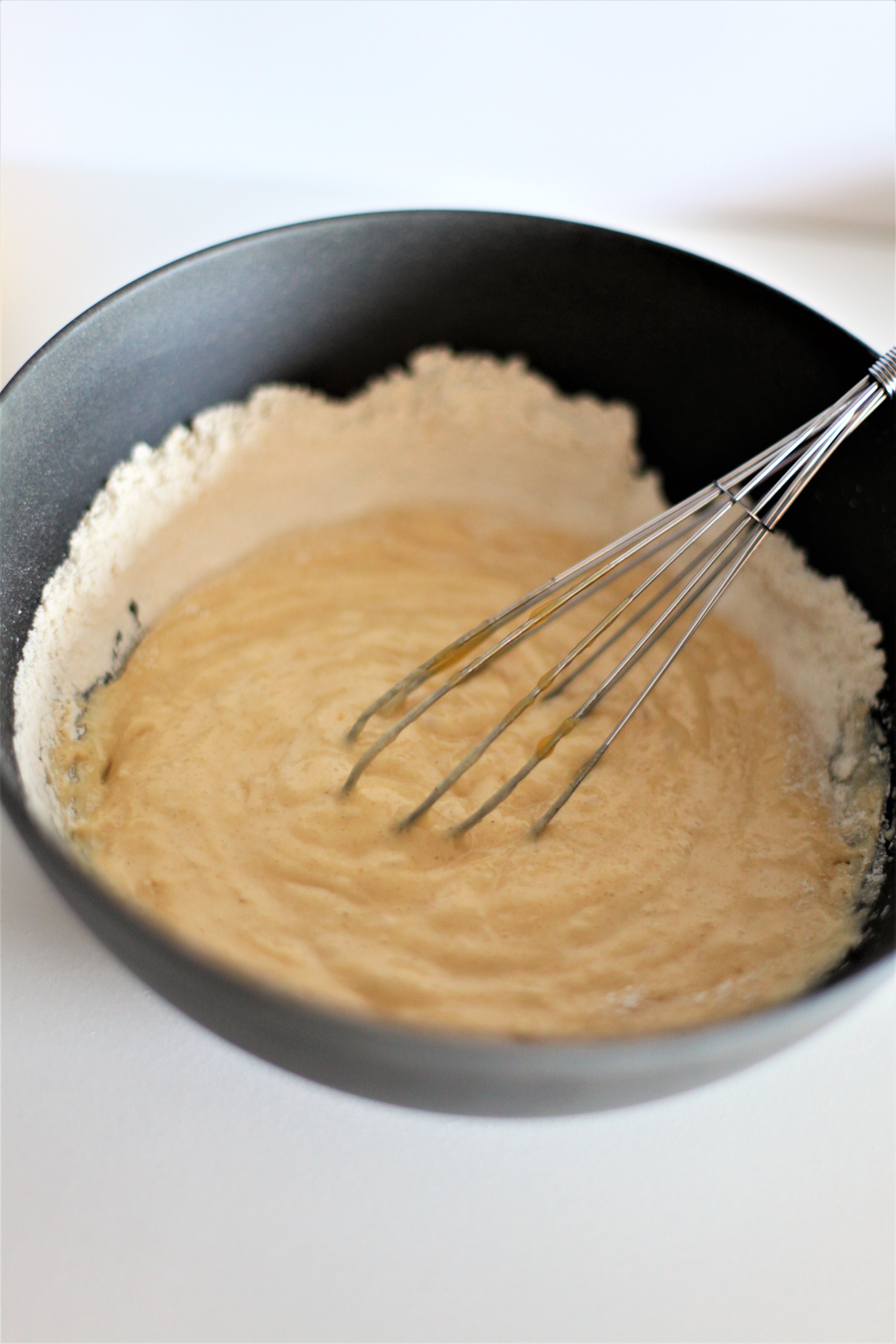 2. Rør sammen alle tørre ingredienser i en bolle. Rør så inn de våte ingrediensene litt og litt om gangen med visp.