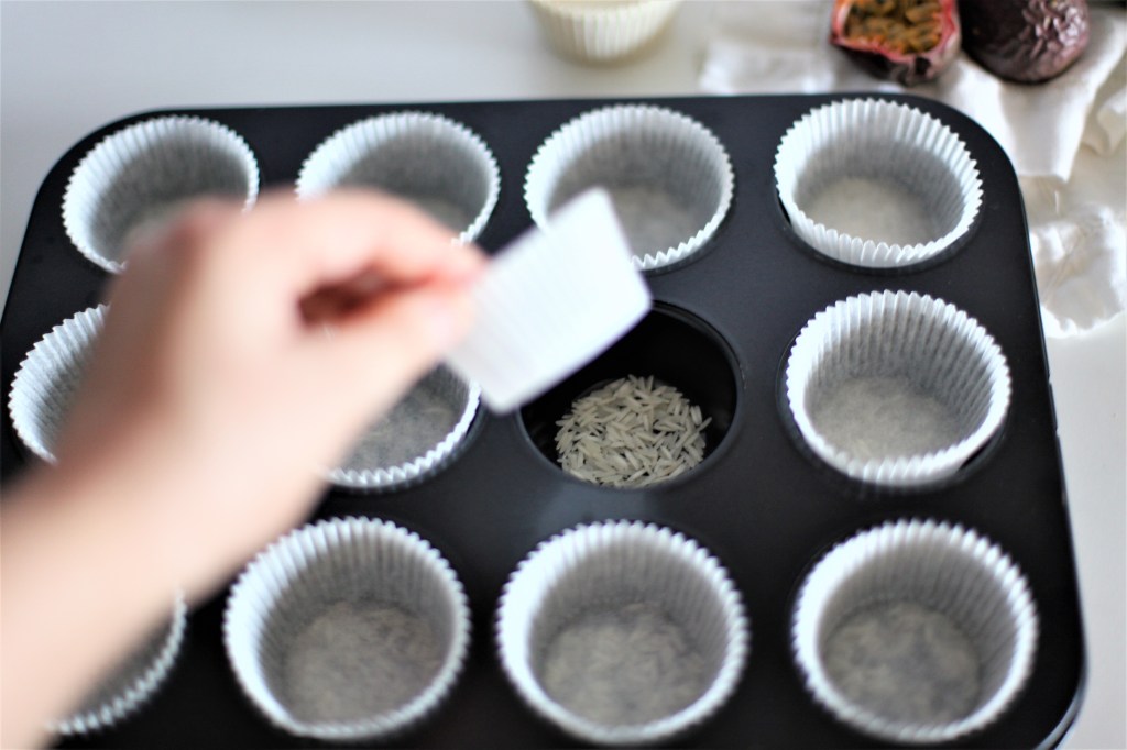 Tips: Om du tar litt ris under hver muffinsform i muffinsbrettet så blir ikke muffinsformen så fettete.