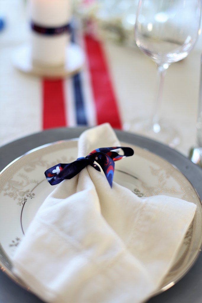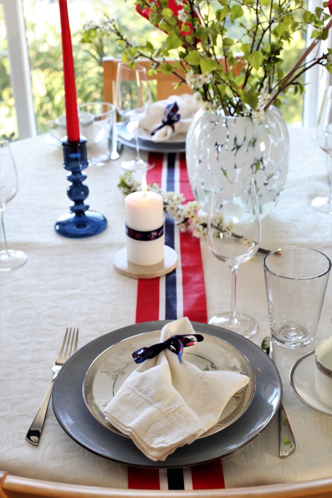 Dekking: Har du servises, glass eller dekketallerkener/brikker som går i rødt, hvit og blått så er dette en ypperlig anledning til og finne det frem. Et tips på dette kan være og dekke med røde brikker, blå dekketallerken og en hvit asjett. Vær kreativ med serviettene. Sett dem i glasset, pynt dem med en sløyfe eller brett den elegant. Prøv deg frem og se hva som passer din spise situasjon best. I år brukte jeg blå dekketallerken, hvit asjett og hvit tøy serviett med 17 Mai sløyfe.