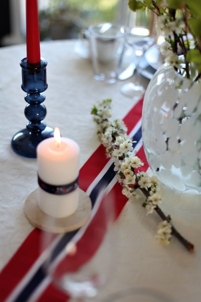 Pynt: Brukt det du har hjemme som passer til 17 mai temaet. Finn frem alt av lysestaker, vaser, skåler, lys, sløyfer og flagg som kan passe. Når du skal pynte så hjelper det å tenke i oddetall og høyde forskjeller. Er alt i samme høyde så kan det raskt se rart ut, og lett føles som om det mangler noe. Prøv derfor og bruk 3 forskjellige høyder. Lek så litt med di ellementen du har. Å prøv deg frem til du finner et sett up du liker.