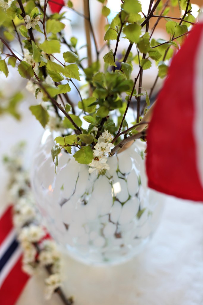 I vasen kan du for eksempel ha en hvit bukett med flagg 2 flagg i eller en bukett som har alle tre fargene. Er ingen av gjestene allergiske mot pollen så kan du ha bjørk kvister og Norges flagg i vasen. Dette kan også gjøre seg godt ute. Andre grønne planter og/eller blomster kan gjøre seg godt på bordet. Det grønne kan være et fin avbrekk fra alle de andre fargene på bordet. Som for eksempel å legge eføy over bordet. Grønt er alltid nøytralt så det passer til det meste.