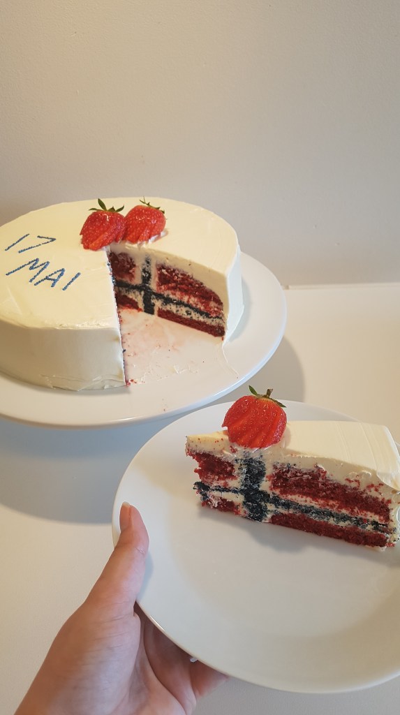 Min favoritt kake og lage til 17 mai er ei Norgesflagg kake. Jeg snakker ikke om en kake som er pyntet som norgesflagget på utsiden men på innsiden. Dette er ikke noe jeg har funnet på for meg selv så her må jeg gi kreditten til noen andre. Her finner ut link til hvordan du kan lage kaken og en youtube video.