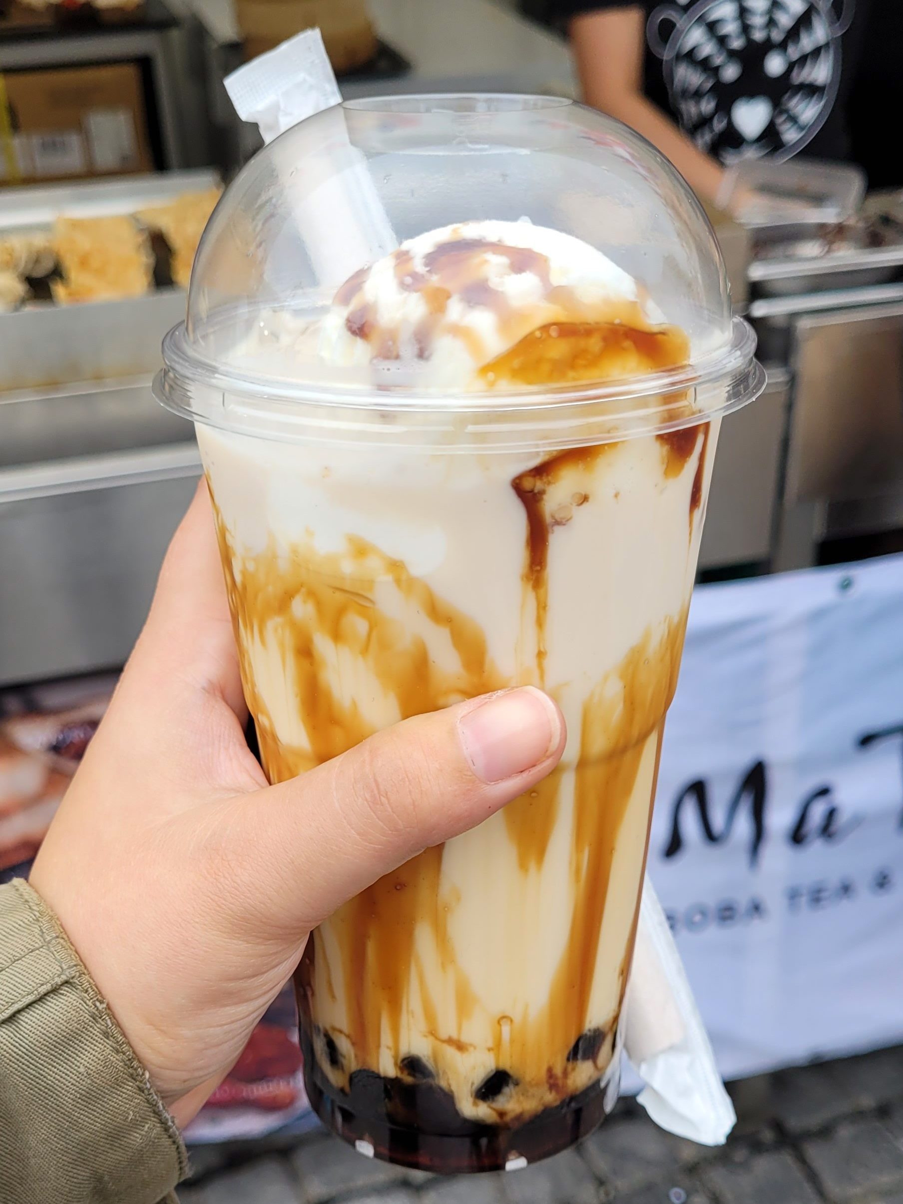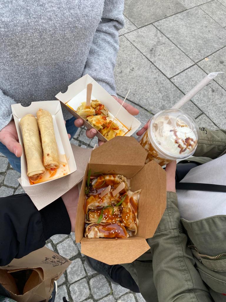 Først gikk vi en runde for og se på hva alternativene var. Når vi hadde bestemt oss for hva vi ville spise så gikk vi og kjøpte det. Regelen ble kjapt at vi delte på det vi kjøpte. Jeg ønsket og prøve Boba tea. Søstrene mine ønsket seg våruller og dumplings.
