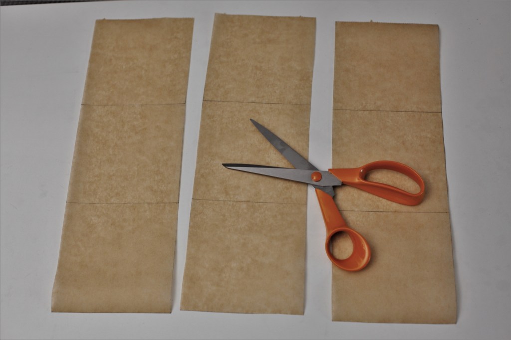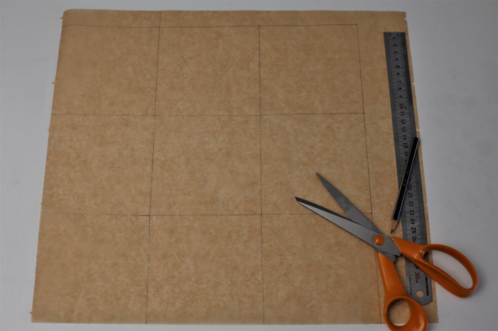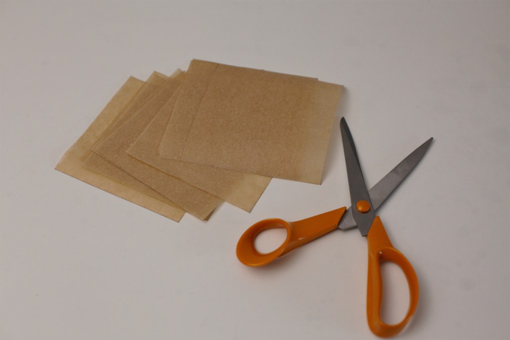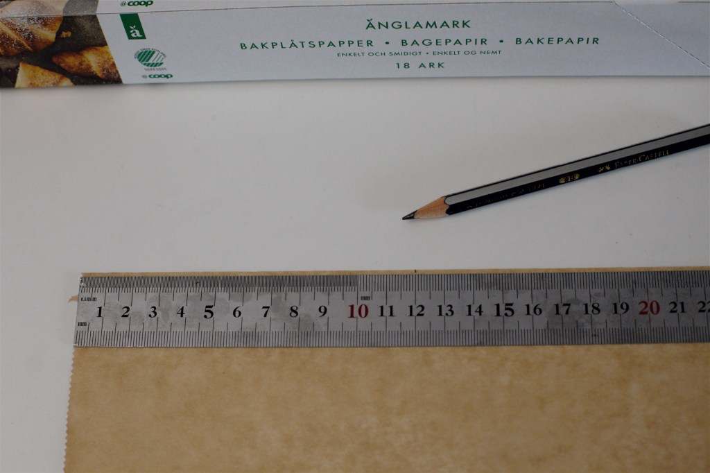 1. Mål opp 9 stk 12 cm x 12 cm firkanter med blyant på bakepapiret/bakearket. Klipp så ut firkantene. Hver firkant blir en form så klipp ut så mange du trenger.