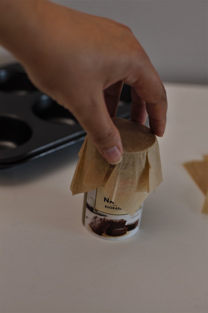 2. Legg de oppklipte firkantene oppå natron boksen. Pass på at det er på midten. Klem/brett så ned det resterende papiret langs kanten.