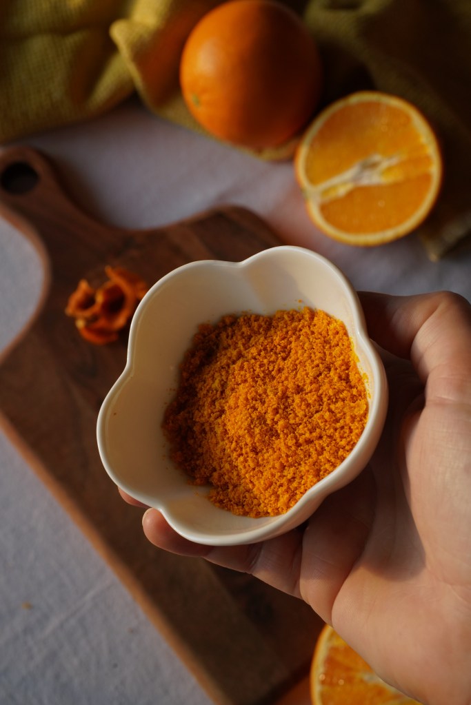 I denne oppskriften så bruker jeg tørket appelsin skall som jeg har laget pulver ut av. Oppskriften på det finner du på bilde under.
